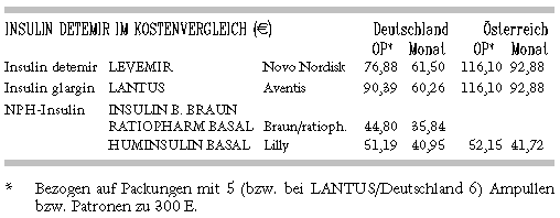 KOSTEN: Bezogen auf eine tägliche Dosis von 40 Einheiten (E) sind für Insulin detemir (LEVEMIR) monatlich 61,50 € aufzuwenden und damit etwa gleich viel wie für das Kunst-Basalinsulin glargin (LANTUS, 60 €/Monat). Gegenüber NPH-Insulin verursacht LEVEMIR Mehrkosten von 50% bis 72% (HUMINSULIN BASAL 41 €, INSULIN B. BRAUN RATIOPHARM BASAL 36 €).