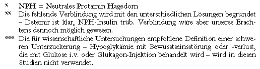 Ein klarer Vorteil in Bezug auf Hypoglykämien fehlt: Lediglich in einer Studie kommen die gefürchteten schweren Unterzuckerungen (Fremdhilfe erforderlich***) nachts seltener vor als unter NPH-Insulin.4 Da sich die Zahl schwerer Hypoglykämien insgesamt in dieser Untersuchung nicht wesentlich unterscheidet, ist anzunehmen, dass solche Ereignisse unter Detemir tagsüber häufiger sind. Eine entsprechende Auswertung fehlt.
