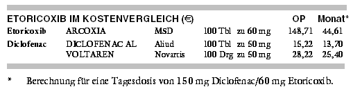 KOSTEN: Etoricoxib (ARCOXIA; 45 €/Monat für täglich 60 mg oder 90 mg) verdreifacht die Kosten einer Behandlung der Arthrose oder