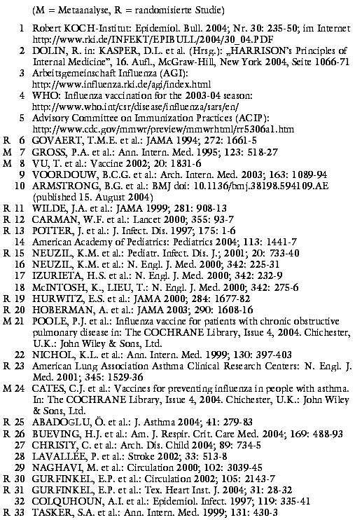 Ungünstig ist die Datenlage für Patienten mit Asthma bronchiale. Zwar weist eine Cross-over-Studie mit mehr als 2.000 Asthmakranken darauf hin, dass entgegen den Ergebnissen kleinerer Arbeiten die Impfung selbst nicht zu einer Häufung von Asthmaanfällen bzw. Verschlechterung der Lungenfunktion führt.23 Ein Nutzen hinsichtlich Senkung von Asthmaanfällen bzw. Komplikationen während der Grippesaison ist jedoch nach einer Metaanalyse kontrollierter Studien unzureichend belegt.24 In zwei aktuellen randomisierten kontrollierten Studien, eine davon mit 6 bis 18 Jahre alten Kindern und Jugendlichen, ergibt sich kein Einfluss auf Häufigkeit oder Schwere influenzabedingter Asthmaattacken.25,26 Nach einer retrospektiven Kohortenstudie mit 800 Asthmakindern verdoppelt sich bei geimpften Kindern im Jahr nach der Impfung das Risiko, wegen Asthmabeschwerden notfallmäßig einen Arzt aufzusuchen gegenüber ungeimpften Gleichaltrigen (Odds Ratio 2,0; 95% CI 1,2 bis 3,1).27