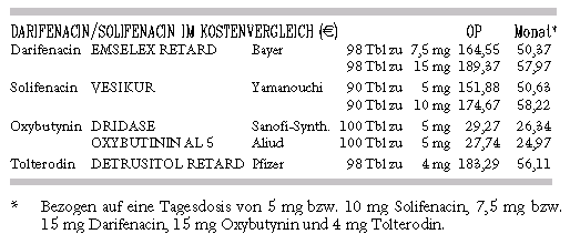 THERAPIEKOSTEN: Die Behandlung mit täglich 5 mg oder 10 mg Solifenacin (VESIKUR) bzw. 7,5 mg oder 15 mg Darifenacin (EMSELEX) verdoppelt
