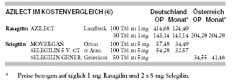 KOSTEN: Die Behandlung mit Rasagilin (AZILECT) ist mit 124 € monatlich nahezu viermal so teuer wie mit dem auch als Generikum verfügbaren