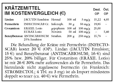 Permethrin (INFECTOSCAB) 5% und Lindan (JACUTIN) sind besser geprüfte Mittel mit guter Wirksamkeit bei Krätze. Beide gehören jedoch zu den toxischeren Substanzen. Neurologische Störwirkungen und Resistenzentwicklung sind Anlass zur Sorge. Nach Abwägen der Daten zu Wirksamkeit und Toxizität und wegen fehlender gut untersuchter Alternativen stufen wir dennoch Permethrin als Mittel der Wahl ein.