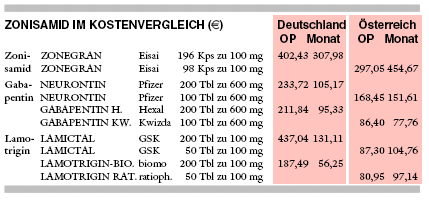 KOSTEN: Mit 308 € monatlich bei täglich 500 mg Zonisamid ist das Zusatzantiepileptikum dreimal so teuer wie Gabapentin (dreimal täglich