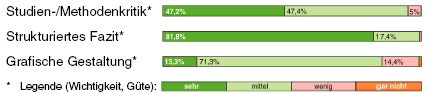 Umfang, Studienkritik und grafische Gestaltung: 96,2% halten den Umfang der a-t-Beiträge für angemessen, 2,3% für zu knapp und 1,5% für zu ausführlich. Die Mehrheit legt Wert auf ausführliche Studienbewertungen, die Methodenkritik einschließt, sowie auf Erläuterungen statistischer/epidemiologischer Begriffe und ein strukturiertes Fazit mit komprimierten Handlungsanweisungen. Auffällig häufig wird der Stellenwert dieser Zusammenfassungen hervorgehoben: Exemplarische Kommentare: "Hilft dem Leser sehr." "Die fett gedruckte Zusammenfassung bringt's einfach."