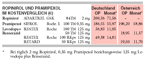 KOSTEN: Die monatliche Therapie mit 2 mg/Tag Ropinirol (ADARTREL) kostet 72 € und damit ungefähr ein Viertel mehr als mit 0,35 mg/Tag