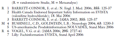 Auch in Verbindung mit dem verwandten Tamoxifen (NOLVADEX u.a.) besteht Verdacht auf ein erhöhtes Schlaganfallrisiko.4,5 In der ebenfalls kürzlich publizierten STAR***-Studie, einem Vergleich von Tamoxifen und Raloxifen zur Primärprävention von Brustkrebs, unterscheiden sich die beiden Mittel im Hinblick auf den primären Endpunkt und auch im Hinblick auf die Schlaganfallrate nicht.6 In Kanada hat Lilly vor einer Zunahme tödlicher Schlaganfälle unter Raloxifen bei Frauen nach den Wechseljahren mit erhöhtem kardiovaskulären Risiko gewarnt.2 Die aktuelle deutsche Fachinformation zu EVISTA nennt das Risiko nicht.7