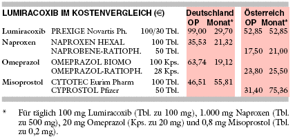 KOSTEN: Lumiracoxib (PREXIGE) verteuert mit monatlich 30 € für täglich 100 mg die Behandlung der aktivierten Arthrose im Vergleich zu