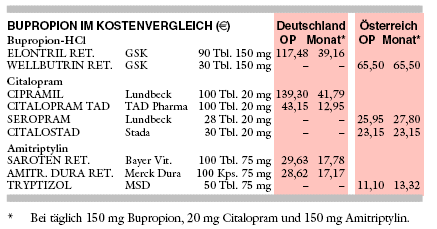KOSTEN: Bezogen auf eine Tagesdosis von 150 mg kostet Bupropion (ELONTRIL) mit monatlich 39 €etwa gleich viel wie das Citalopram-Original CIPRAMIL (42 €, bei 20 mg/Tag), aber dreimal so viel wie ein Citalopram-Generikum (z.B. CITALOPRAM TAD: 13 €) und ungefähr doppelt so viel wie Amitriptylin (AMITRIPTYLIN DURA: 17 €, SAROTEN: 18 €, bei zweimal 75 mg/Tag).