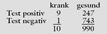 ergibt sich bei 1.000 Getesteten nebenstehendes Bild*. Das bedeutet: Von 10 Erkrankten werden 9 durch den Test erkannt. Allerdings kommt es auch bei 247 von 990 gesunden Testpersonen (25%) zu einem