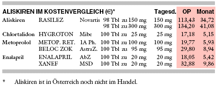 KOSTEN: Monatlich ist für Aliskiren mit 35 € (150 mg täglich) bis 41 € (300 mg täglich) das Sechs- bis Achtfache