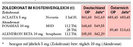 KOSTEN: Einmal jährlich infundiertes Zoledronat (ACLASTA) in einer Dosis von 5 mg verteuert die Osteoporosebehandlung mit jährlichen Kosten von 562 € gegenüber einem Alendronat-Generikum (ALENDRON BETA: 342 €/Jahr für täglich 10 mg) um 64% und ist etwas teurer als das Alendronat-Original FOSAMAX (550 €/Jahr).