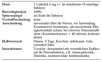 EIGENSCHAFTEN: Aminobisphosphonate wie Alendronat oder Zoledronat werden in den Knochen eingebaut und hemmen die durch Osteoklasten vermittelte Resorption, indirekt aber auch die Neubildung und damit den kontinuierlich stattfindenden Umbau des Knochens.3 Einmal, zweimal oder viermal jährliche Infusionen von Zoledronat (maximal 4 mg/Jahr) steigern in zwölf Monaten die Knochendichte an der Hüfte und Lendenwirbelsäule bei Frauen nach den Wechseljahren mit erniedrigten Ausgangswerten im Vergleich zu Plazebo um 3% bis 5% und damit ähnlich wie einmal täglich per os eingenommene Bisphosphonate wie Alendronat. Marker des Knochenumbaus werden gesenkt und bleiben auch ein Jahr nach einmaliger Infusion deutlich unterdrückt.4