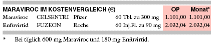 KOSTEN:Die Einnahme von täglich 600 mg Maraviroc (CELSENTRI) kostet pro Monat 1.100 € und ist etwa halb so teuer wie das in vergleichbarer Indikation zugelassene, ausschließlich parenteral anzuwendende Enfuvirtid (FUZEON, 2.032 €/ Monat für 180 mg/Tag).