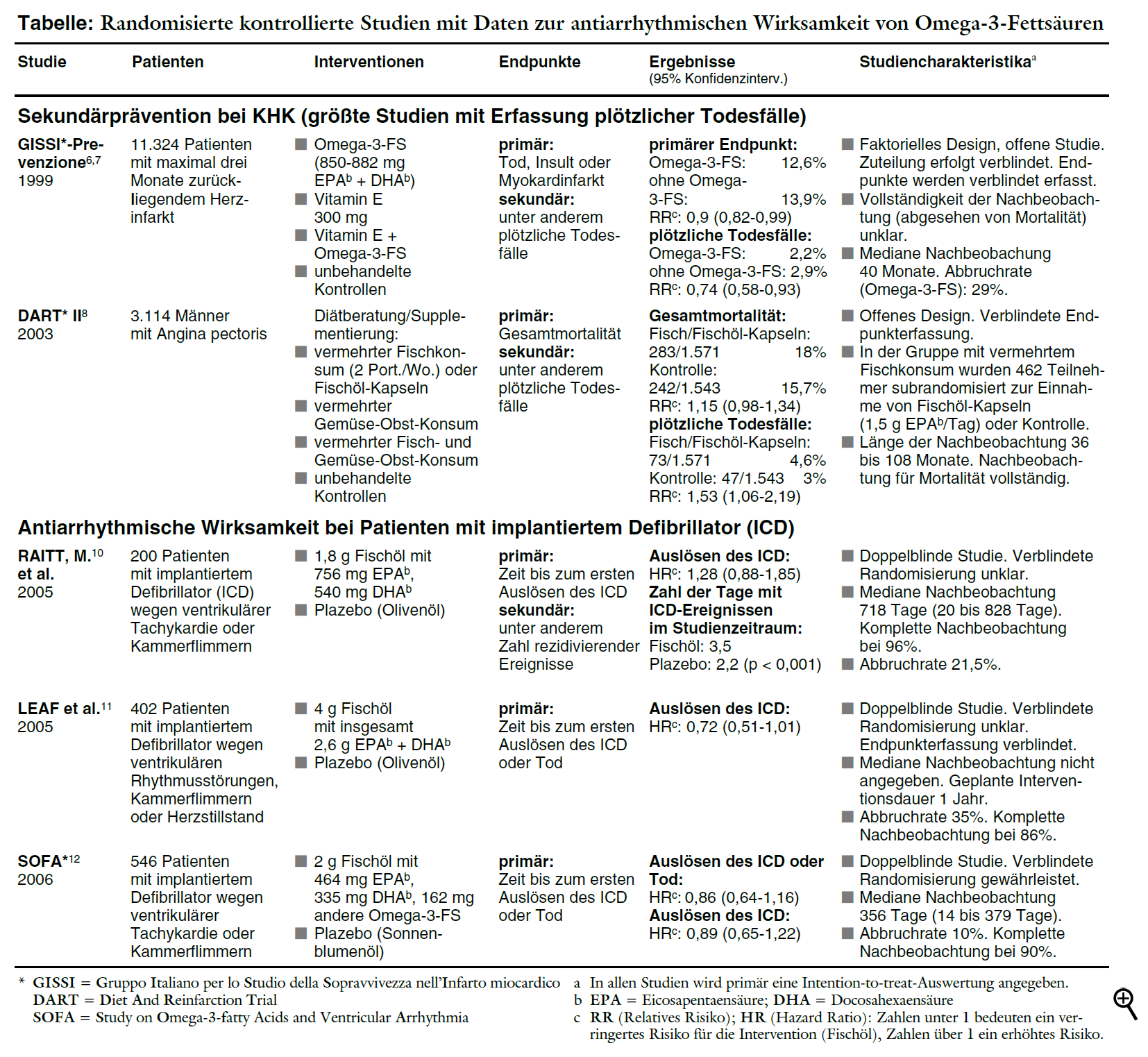 Aus epidemiologischen Daten wird für die vermehrte Aufnahme von Omega-3-Fettsäuren ein Schutz vor kardiovaskulären Erkrankungen abgeleitet. Dies lässt sich in randomisierten kontrollierten Studien nicht einheitlich reproduzieren. Das gilt insbesondere auch für die postulierten antiarrhythmischen Eigenschaften.