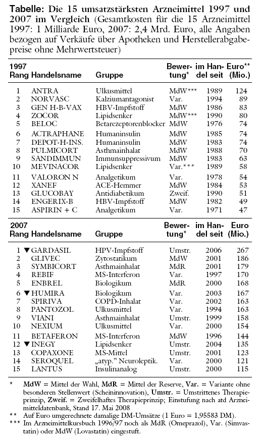 Die 15 umsatzstärksten Arzneimittel des Jahres 2007 erscheinen uns überwiegend als nicht zweckmäßig und zum Teil riskant. Nur jeweils 2 Produkte bewerten wir als Mittel der Wahl oder der Reserve.