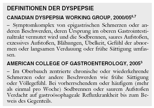 Mit dem Begriff Dyspepsie werden chronische oder wiederkehrende Beschwerden im Oberbauch wie epigastrische Schmerzen oder Völlegefühl bezeichnet. Die Schwierigkeiten, die sich bei der Diagnose und Therapie der Dyspepsie stellen, dürften sich auch darin ausdrücken, dass international nach wie vor keine einheitliche Definition existiert (siehe Kasten). Kontrovers ist dabei besonders, ob der Begriff auch dann gebraucht werden soll, wenn eine Symptomatik vorherrscht, die auf eine Refluxkrankheit hinweist, wie Sodbrennen oder saures Aufstoßen. US-amerikanische Leitlinien und die internationalen Rom-Kriterien schließen Patienten mit vorherrschendem Sodbrennen aus.1-3 Britische und kanadische Leitlinien legen dagegen eine breite Definition einschließlich Sodbrennen zugrunde.4-7 Diese Definition bildet die klinische Realität wahrscheinlich besser ab, da sich Reflux- und andere dyspeptische Symptome häufig überlappen und die Symptome einen geringen Vorhersagewert für pathologische Ursachen haben. Zu unterscheiden ist zudem die funktionelle Dyspepsie (früher: nicht ulzeröse Dyspepsie, auch: Reizmagen), bei der organische Ursachen ausgeschlossen wurden, von der - endoskopisch - nicht abgeklärten Dyspepsie. Die Unterscheidung ist von Bedeutung, da in der Praxis ein Teil der Dyspepsiepatienten auch ohne formale Diagnose behandelt wird.4