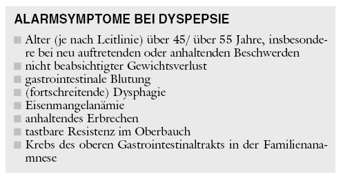 Bei 10% der Patienten, die sich in der Allgemeinpraxis wegen Dyspepsie vorstellen, liegen so genannte Alarmsymptome vor (siehe Kasten). Die in internationalen Leitlinien übereinstimmend definierten Alarmsymptome, die eine Indikation für die prompte gastroskopische Untersuchung darstellen, sind die gastrointestinale Blutung, (progressive) Schluckstörungen, nicht beabsichtigter Gewichtsverlust, anhaltendes Erbrechen, (Eisenmangel-) Anämie und eine tastbare Resistenz im Oberbauch, in einigen Leitlinien außerdem Krebs des oberen Gastrointestinaltrakts in der Familienanamnese.1,3,4-7,17 Da organische Ursachen für dyspeptische Beschwerden einschließlich Magen- und Speiseröhrenkrebs mit dem Alter zunehmen, wird meist eine Altersschwelle definiert, ab der generell die initiale endoskopische Abklärung empfohlen wird. In mehreren englischsprachigen Leitlinien liegt diese Altersschwelle bei über 55 Jahren.1,3,5 Aktuelle deutsche Leitlinien finden wir nicht. Nach einer Leitlinie der Deutschen Gesellschaft für Verdauungs- und Stoffwechselkrankheiten von 2001 soll die Schwelle jedoch bei über 45 Jahren liegen.21 Auch von den Patienten mit Alarmsymptomen haben die meisten keinen Krebs. Der positive prädiktive Wert liegt in Studien meist unter 11% und oft bei 1%.1