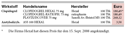 Azetylsalizylsäure (ASS, ASPIRIN, Generika) bleibt auf Grund der guten Datenlage und des weiterhin deutlich niedrigeren Preises bei chronischen atherosklerotischen Erkrankungen Mittel der ersten Wahl.
