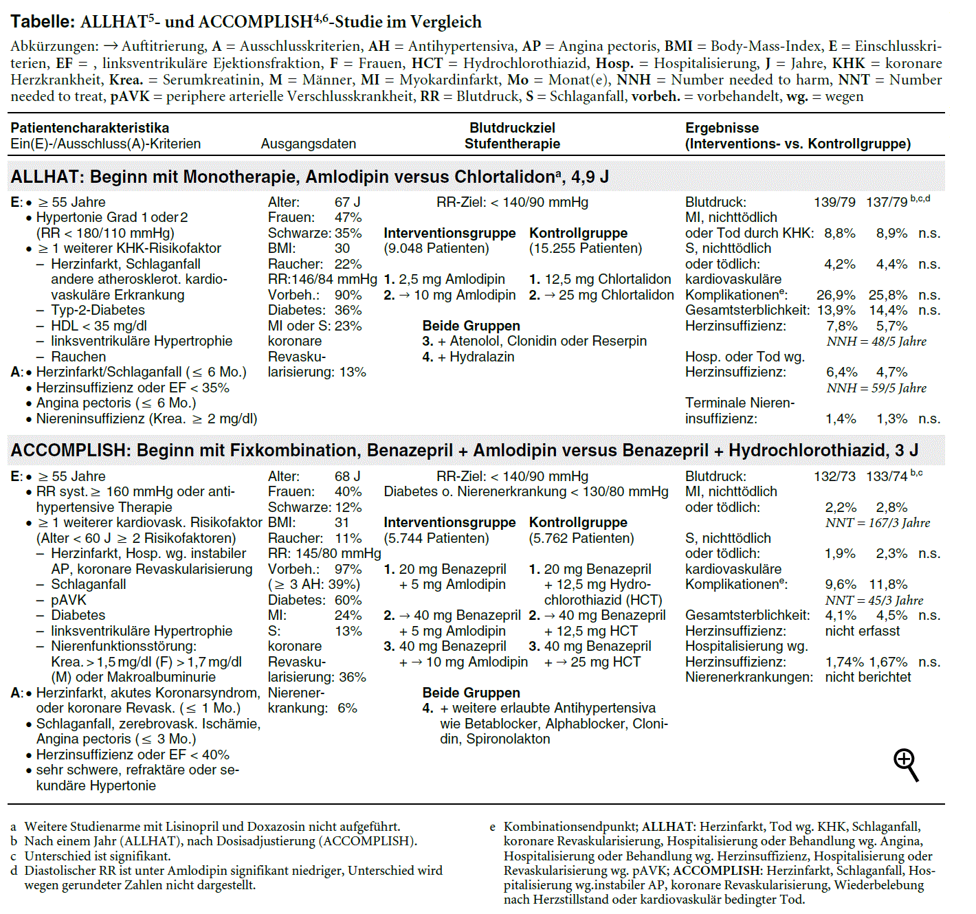 Ähnlich wie in der vor sechs Jahren publizierten ALLHAT-Studie5 nehmen an ACCOMPLISH Hochrisikopatienten mit Hypertonie teil (siehe Tabelle Seite 14). Zu den Ausschlusskriterien gehören akute kardiovaskuläre Komplikationen und Herzinsuffizienz oder linksventrikuläre Funktionseinschränkung.6 97% der Patienten sind antihypertensiv vorbehandelt, knapp 40% mit mindestens drei Hochdruckmitteln. Sie werden ähnlich wie in ALLHAT ohne Auswaschphase auf die Studienmedikation umgestellt. Nach einmonatiger Behandlung mit der niedrig dosierten Fixkombination wird die Dosis der ACE-Hemmer-Komponente bei allen Patienten verdoppelt. Ist das Blutdruckziel unter dieser Therapie nicht erreicht, wird im nächsten Schritt die Dosis des jeweiligen Kombinationspartners verdoppelt. Anschließend können in beiden Gruppen die in der Studie erlaubten Zusatzantihypertensiva ergänzt werden. primärer Endpunkt ist die Kombination aus Herzinfarkt, Schlaganfall, Krankenhausaufnahme wegen instabiler Angina pectoris, Wiederbelebung nach Herzstillstand, koronare Revaskularisierung oder kardiovaskulär bedingter Tod.4