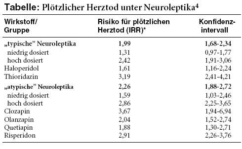 Während das Agranulozytoserisiko unter Clozapin (LEPONEX, Generika) mit einer Todesrate von 0,2 pro 1.000 Patientenjahre allgemein als schwerwiegend eingestuft und Überwachungsmaßnahmen zur Risikoabwehr eingeführt wurden, wird das Risiko eines plötzlichen Herztodes unter Neuroleptika unterschätzt. In einer aktuellen retrospektiven Kohortenstudie4 liegt es mit 3,3 pro 1.000 Patientenjahre um ein Vielfaches höher.5 Die Analyse basiert auf bis Dezember 2005 ausgewerteten Daten des US-amerikanischen Medicaid Systems für Einwohner mit geringem Einkommen. 44.000 Anwender eines "klassischen" Neuroleptikums und 46.000 unter einem "Atypikum" werden mit knapp 190.000 Kontrollpersonen ohne Neuroleptikum verglichen.4 Die für Risikofaktoren adjustierte Rate eines plötzlichen Herztodes verdoppelt sich jeweils ("klassische" Mittel: Incidence Rate Ratio*[IRR] 1,99; 95% Konfidenzintervall [CI] 1,68-2,34; "Atypika": IRR 2,26; 95% CI 1,88-2,72).4 Mit steigender Dosis nimmt in beiden Gruppen das Risiko zu. Anders als bei "klassischen" Neuroleptika ist bei Einnahme von "Atypika" das Risiko bereits unter niedrigen Dosierungen signifikant erhöht (siehe Tabelle).4 Die Ergebnisse erscheinen robust und bestätigen sich auch bei nicht schizophrenen Anwendern.1