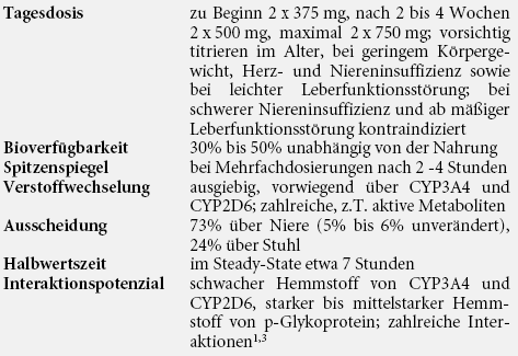 WECHSELWIRKUNGEN: Wechselwirkungen sind häufig. Starke Hemmstoffe von CYP3A4 wie das Azolantimykotikum Itraconazol (SEMPERA, Generika) oder das Makrolid Clarithromycin (KLACID; Generika) können die Ranolazinspiegel bis zum Vierfachen erhöhen und sind kontraindiziert. Bei mäßigen Hemmstoffen von CYP3A4 wie z.B. Erythromycin (ERYHEXAL u.a.) oder von p-Glykoprotein wie z.B. Verapamil (ISOPTIN, Generika) ist besondere Vorsicht geboten. Gleichzeitige Einnahme von CYP3A4-Induktoren wie Carbamazepin (TEGRETAL, Generika) vermindert die Plasmakonzentration von Ranolazin deutlich, es sollte dann nicht verordnet werden. Vorsicht: Unter Behandlung mit Ranolazin können die Spiegel von Herzglykosiden, Statinen, trizyklischen Antidepressiva und Neuroleptika ansteigen. Kombination mit Mitteln, die ebenfalls die QTc-Zeit verlängern (z.B. trizyklische Antidepressiva), sollte vermieden werden.1,3 Komedikation mit Antiarrhythmika der Klasse Ia und III ist kontraindiziert.3