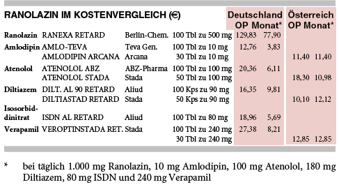 KOSTEN: Bei Monatskosten von 78 € verteuert Ranolazin (RANEXA, 2 x 500 mg/Tag) die Therapie gegenüber der mit Generika wie Amlodipin (AMLO-TEVA, 4 €, 10 mg/Tag), Atenolol (ATENOLOL ABZ, 6 €, 100 mg/Tag), Diltiazem (DILTIAZEM AL 90 RET., 10 €, 2 x 90 mg/Tag), Isosorbiddinitrat (ISDN AL RET., 6 €, 80 mg/Tag) oder Verapamil (VEROPTINSTADA RET., 8 €, 240 mg/Tag) bis zum 20fachen.
