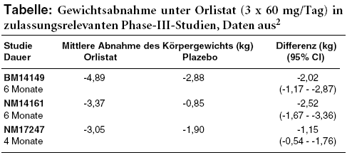 Wird Orlistat abgesetzt, nimmt das Gewicht wieder zu. In einer von zwei plazebokontrollierten Studien mit XENICAL (3 x täglich 120 mg), in denen ein Teil der Verumgruppe nach einem Jahr randomisiert auf Plazebo wechselt, unterscheidet sich der Gewichtsverlust unter dieser Strategie nach einem weiteren Jahr nicht von dem derjenigen Teilnehmer, die die ganze Zeit nur Plazebo eingenommen haben.2,7 Auch in der zweiten Studie wird ein "deutlicher Reboundeffekt" beobachtet.8 Entsprechende Daten finden wir für ALLI nicht. Aber selbst wenn Orlistat weiter eingenommen wird, steigt das Gewicht in plazebokontrollierten Studien ab dem zweiten Anwendungsjahr graduell wieder an.2,9 Ein klinischer Nutzen von Orlistat über die kurzfristige und geringfügige Gewichtsabnahme hinaus ist nicht belegt.10