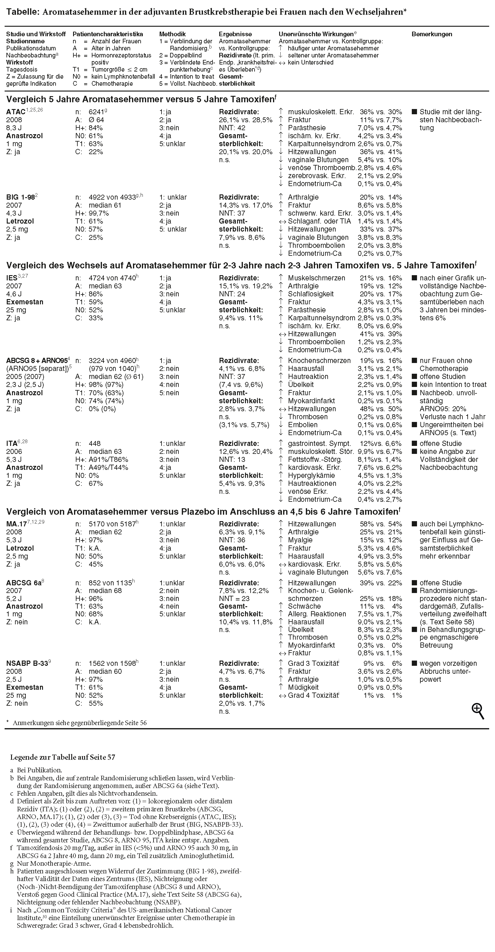 Die Datenlage zur Wechsel- oder Sequenzstrategie wird dominiert von drei methodisch mangelhaften, offen durchgeführten Studien zu Anastrozol (ABCSG**-8-Studie, ARNO**-95-Studie und ITA**-Studie), von denen zwei 2005 als gepoolte Analyse veröffentlicht wurden.4 Eine vom Hersteller AstraZeneca gesponserte und unter seiner Beteiligung durchgeführte Metaanalyse aller drei Studien soll eine Senkung der Gesamtsterblichkeit durch den Aromatasehemmer belegen.11 Sie ist unseres Erachtens wegen Ausschluss von mehr als 25% der ursprünglich randomisierten Patientinnen und einer hohen Verlustrate in der Nachbeobachtung bei den übrigen Frauen nicht aussagekräftig (a-t 2006; 37: 121-2). Von der ABCSG-8-Studie finden wir keine vollständig publizierten aktualisierten Daten. Aus der ARNO-95-Studie wird zwei Jahre nach der gepoolten Analyse, aber mit dem alten Datenstand, eine gesonderte Auswertung veröffentlicht, in der eine (nominell) signifikante Senkung der Gesamtsterblichkeit im Anastrozolarm beschrieben wird.5 Neben Ungereimtheiten in den Angaben zum Zeitpunkt der Randomisierung und der Zahl der randomisierten bzw. ausgewerteten Teilnehmerinnen in den nunmehr vorliegenden drei Publikationen zu ARNO 95 fällt in dieser Studie eine hohe Verlustrate in der Nachbeobachtung auf, die bereits nach einem Jahr etwa 20% beträgt. Einen lebensverlängernden Nutzen von Anastrozol erachten wir auf der Basis dieser Daten als nicht valide belegt. In aktualisierten Auswertungen von IES**- und ITA-Studie bleibt die signifikant geminderte Rezidivrate unter Exemestan (AROMASIN) bzw. Anastrozol erhalten, ohne signifikanten Einfluss auf die Sterblichkeit.3,6 Die ITA-Studie fällt dadurch auf, dass sie als kleinste Untersuchung die größte Minderung der Rezidivrate zeigt.6