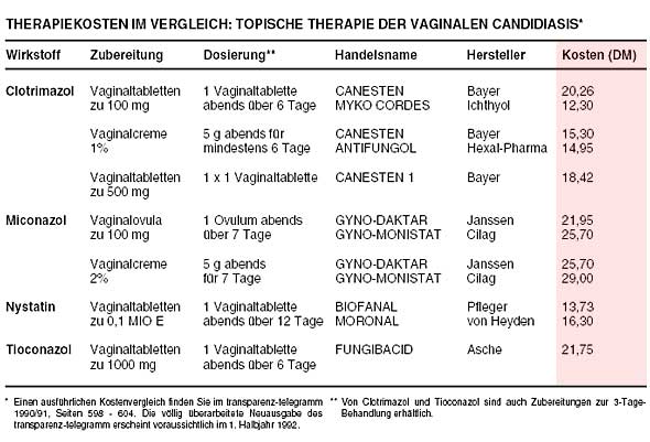 die Auswahl nach den Therapiekosten erfolgen. Für Clotrimazol (CANESTEN u.a.) bestehen die meisten Erfahrungen. Zahlreiche preiswerte