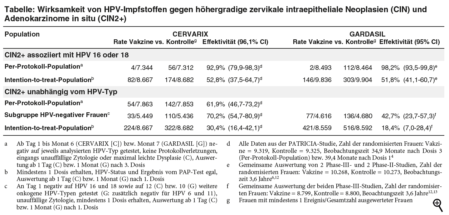 Im Hinblick auf höhergradige intraepitheliale Neoplasien der Zervix (CIN2+), die mit HPV 16 oder 18 assoziiert sind, unterscheiden sich die Daten zur Effektivität der beiden HPV-Impfstoffe CERVARIX und GARDASIL nicht wesentlich.
