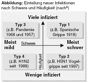 Auch das Paul-Ehrlich-Institut (PEI) schürt in erster Linie Ängste, wenn es für den Herbst schwere Krankheitsfälle und Todesopfer7 prognostiziert. Gefahr im Verzug vermittelt auch der Kommentar des PEI-Präsidenten zu den neuen Impfstoffen: "Wenn wir lange testen, riskieren wir viele Tote".8 Panikgefühl verursachen zudem die alarmierenden Schlagzeilen, die seit Wochen in den Medien dominieren. "Wie die Schweinegrippe im Winter wüten kann, zeigte sich in Argentinien", weiß beispielsweise Die Zeit.9 Solche Schreckensmeldungen basieren auf der simplen Folgerung Pandemie = drohende Welle von Todesfällen. Die tatsächliche Schwere der Infektionen bleibt unberücksichtigt. Eine vorgeschlagene einfache Klassifizierung macht die Unterschiede in der Bedrohlichkeit anschaulich (Abbildung). Die Schweinegrippe wäre demzufolge als Typ-3-Pandemie (häufige und meist milde Infektionen) einzustufen, im Gegensatz beispielsweise zur Vogelgrippe: Typ 2, wenige, aber meist schwere Infektionen.6