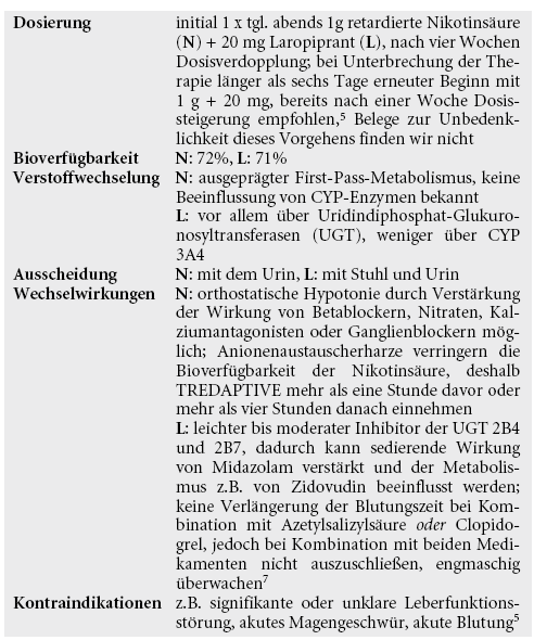 Die Fixkombination TREDAPTIVE, die neben retardierter Nikotinsäure den Prostaglandinrezeptorantagonisten Laropiprant enthält, senkt wie retardierte Nikotinsäure allein (NIASPAN) erhöhte LDL- und Triglyzeridwerte und steigert das HDL-Cholesterin. Ein Einfluss auf kardiovaskuläre Ereignisse ist für beide Präparate nicht belegt (siehe auch Seite 109).