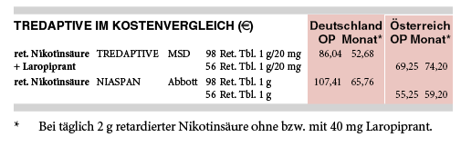 KOSTEN: Die Therapie mit retardierter Nikotinsäure plus Laropiprant (TREDAPTIVE; täglich 2 g + 40 mg) kostet pro Monat 53 € und ist damit in Deutschland 20% günstiger als retardierte Nikotinsäure allein (NIASPAN: 66 € für 2 g/Tag).
