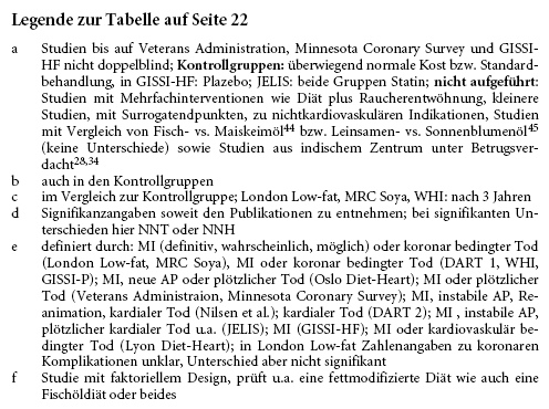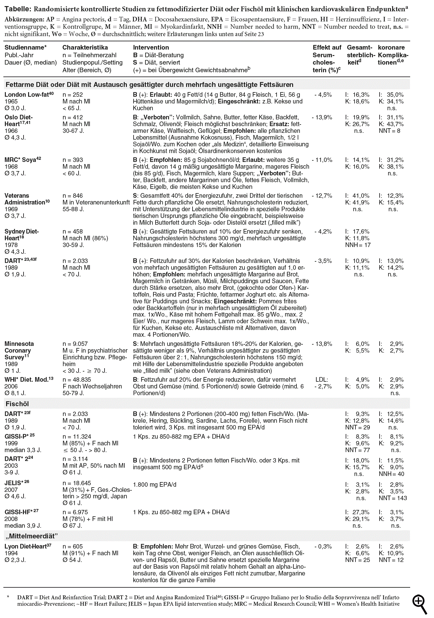 Eine aktuelle Metaanalyse unter Einschluss der WHI-Studie findet in der Gesamtauswertung ebenfalls keinen mortalitätssenkenden Effekt einer fettarmen (RR 0,98; 95% CI 0,90-1,06) oder einer fettmodifizierten Diät (RR 0,88; 95% CI 0,76-1,02). Werden ausschließlich Studien betrachtet, in denen das Verhältnis von ungesättigten zu gesättigten Fettsäuren in der Diät zu Gunsten der ungesättigten verändert und außerdem eine signifikante Cholesterinsenkung erreicht wird, ergibt sich jedoch eine Minderung sowohl von koronaren Komplikationen und koronarer Sterblichkeit als auch der Gesamtsterblichkeit.19 Bei einer der in diese Auswertung aufgenommenen Studien, einer großen finnischen Studie mit Patienten in zwei psychiatrischen Krankenhäusern (Finnish Mental Hospital Study),9 die insbesondere das Ergebnis zur Gesamtsterblichkeit entscheidend beeinflusst, handelt es sich allerdings um eine Interventionsstudie ohne randomisierte Zuteilung. Die Auswertung bleibt daher unseres Erachtens ohne hinreichende Aussagekraft.