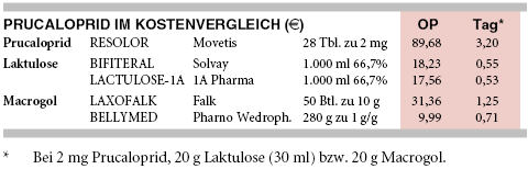 KOSTEN: Verglichen mit 20 g Laktulose (z.B. BIFITERAL: 0,55 €/Tag, LACTULOSE-A1: 0,53 €,) oder 20 g Macrogol (z.B. LAXOFALK: 1,25 €, BELLYMED: 0,71 €/Tag) ist die Therapie der chronischen Obstipation mit täglich 2 mg Prucaloprid (RESOLOR: 3,20 €/Tag) 2,5- bis 6fach teurer.
