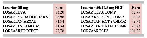 Mit Ablauf des Patents für den Angiotensin-II-Antagonisten Losartan (LORZAAR) kommen die ersten Nachfolgepräparate auf den Markt. 2009 verkaufte MSD über Apotheken noch knapp 1,1 Mio. Packungen LORZAAR bzw. LORZAAR PLUS im Wert von 74 Mio. € (Herstellerabgabepreis ohne MwSt.). In der Tabelle vergleichen wir die Preise der meistverordneten Packungen: 98 Tbl. zu 50 mg Losartan sowie 98 Tabletten zu 50 mg Losartan plus 12,5 mg Hydrochlorothiazid (HCT). Die Generika kosten derzeit bis zu 35% weniger als die Originale: