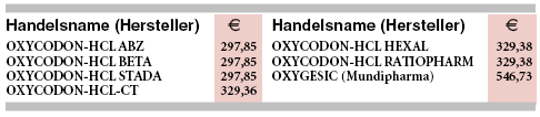 Das Zentrallaboratorium deutscher Apotheker überprüft in einer Reihenuntersuchung die pharmazeutische Qualität von sieben retardierten Oxycodon-Präparten zu 40 mg. Alle geprüften Produkte entsprechen den Anforderungen des amerikanischen bzw. europäischen Arzneibuches in Bezug auf Identität, Gleichförmigkeit der Masse, Wirkstoffgehalt (gefunden zwischen 93,7% und 96,9% der Deklaration) und In-vitro-Freisetzung (nach 8 Stunden bei OXYGESIC 90,3%, bei Generika zwischen 94,2% und 98,3%). Das Original und die Generika sind allerdings unterschiedlich retardiert: OXYGESIC setzt Oxycodon aufgrund einer kombinierten Retardierung in den ersten vier Stunden rascher frei als alle geprüften Generika, die nahezu identische Freisetzungsprofile aufweisen (KAUNZINGER, A. et al.: Pharm. Ztg. 2010; 155: 1344-8). Nachfolgend vergleichen wir die Preise der geprüften Präparate auf der Basis von 100 Retardtabletten zu 40 mg. Preiswerte Generika kosten 45% weniger als OXYGESIC. Oxycodon erachten wir als Opioidanalgetikum der ferneren Wahl. Wir bevorzugen Morphin, das zudem in etwa äquivalenter Dosis (100 Tabletten zu 60 mg Retard) bereits für 95,09 € (MORPHANTON) angeboten wird, also über 80% preiswerter als OXYGESIC, -Red.