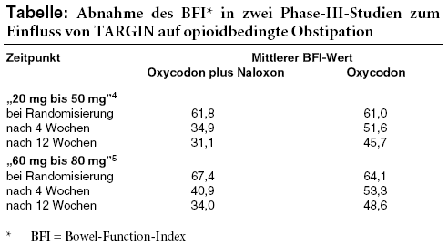 2006 wurde die retardierte Oxycodon-Naloxon-Fixkombination TARGIN im "Fast-Track"-Verfahren ausschließlich auf der Basis von Phase-I- und -II-Daten für die Behandlung starker Schmerzen zugelassen (a-t 2006; 37: 119-20). Bereits 2008 machte TARGIN nahezu die Hälfte der Oxycodon (OXYGESIC RETARD, Generika)-Verordnungen aus.1 Der Opioidantagonist Naloxon soll im Darm der Opioid-induzierten Obstipation entgegenwirken, aufgrund eines hohen First-pass-Metabolismus aber keine nennenswerten systemischen Effekte haben.2 Inzwischen finden wir per Datenbankrecherche (PubMed) drei vollständig publizierte randomisierte doppelblinde Phase-III-Studien:3-5