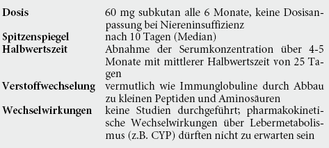 EIGENSCHAFTEN: Denosumab ist ein humaner monoklonaler IgG-2-Antikörper, der gegen den so genannten RANK*-Liganden (RANKL) gerichtet ist und die Interaktion dieses Liganden mit seinem Rezeptor hemmt. RANKL ist ein Zytokin aus der Superfamilie der Tumornekrosefaktoren. Es hat eine wichtige Funktion für die Bildung, Funktion und das Überleben von Osteoklasten, die für die Knochenresorption zuständig sind. RANKL hat aber auch eine wichtige Funktion im Immunsystem, wo es an der Differenzierung von B- und T-Zellen sowie an der Reifung von dendritischen (Antigen-präsentierenden) Zellen beteiligt ist.2