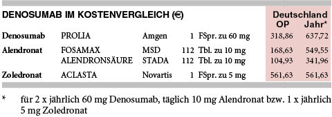 KOSTEN: Denosumab (PROLIA) wird mit Jahreskosten von 638 € für zweimal jährlich 60 mg rund 15% teurer angeboten als Originalpräparate mit Alendronat (FOSAMAX; Jahreskosten 550 € für täglich 10 mg) und Zoledronat (ACLASTA; Jahreskosten 562 € für 1 x jährlich 5 mg). Gegenüber einem Alendronatgenerikum (z.B. ALENDRONSÄURE STADA; Jahreskosten 342 €) verteuert Denosumab die Osteoporosetherapie um mehr als 85%.