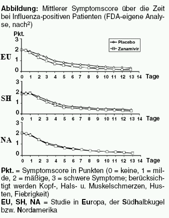 Für Zanamivir, den ersten angebotenen Neuraminidasehemmer, wurden die Daten in den USA als so unzureichend eingestuft, dass sich das zuständige Beraterkomitee mit 13 zu 4 Stimmen gegen eine Zulassung aussprach. Auch der Statistiker der Arzneimittelbehörde FDA, der die Daten zu Zanamivir ausgewertet hat, war gegen die Zulassung.2 Gründe dafür gab es mehrere: Von den drei zulassungsrelevanten Phase-III-Studien verlief die größte negativ, und bei Risikopatienten traten dort Komplikationen unter Zanamivir tendenziell häufiger auf als unter Plazebo. In dieser in Nordamerika durchgeführten Untersuchung war der Gebrauch symptomatisch wirkender Mittel wie Parazetamol (BEN-U-RON, Generika) doppelt so hoch wie in der Studie mit dem größten Behandlungseffekt. Die dritte Untersuchung lag jeweils dazwischen. Die inverse Beziehung zwischen Einnahme symptomatisch wirkender Mittel und Behandlungseffekt deutet nach Ansicht des FDA-Mitarbeiters auf einen Zusammenhang hin.2 Die gleichzeitige Anwendung könnte die Effekte von Zanamivir überdecken.3 Eine weitere Kritik betraf den primären Endpunkt der Studien, die Zeit bis zur Linderung der Beschwerden, sowie das statistische Verfahren: Beide führen zu einer massiven Überschätzung des Behandlungseffekts, weil beispielsweise eine erneute Verschlechterung der Symptome nach Erreichen des primären Endpunktes - was bei bis zu einem Drittel der Patienten vorkam - nicht in die Auswertung einging.2 In behördeneigenen Analysen lässt sich für den Neuraminidasehemmer praktisch kein Effekt erkennen (Abbildung).