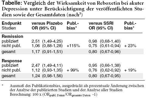 Die publizierten Studien legen einen Nutzen von Reboxetin im Vergleich zu Plazebo nahe. Werden zusätzlich die unveröffentlichten Studien berücksichtigt, lässt sich jedoch gegenüber Scheinmedikament kein signifikanter Einfluss von Reboxetin auf die Rate der Remissionen* und Responder* mehr nachweisen. Die Rate der Patienten, bei denen mindestens eine unerwünschte Wirkung auftritt oder die die Behandlung wegen Störeffekten abbrechen, ist unter dem Noradrenalin-Wiederaufnahmehemmer hingegen deutlich höher (Odds Ratio [OR] 2,14; 95% Konfidenzintervall [CI] 1,59-2,88 bzw. OR 2,21; 95% CI 1,45-3,37). Dabei sind die positiven Effekte in den veröffentlichten Studien doppelt so groß wie im gesamten Datenpool, das Risiko eines Therapieabbruchs jedoch nur halb so hoch.3