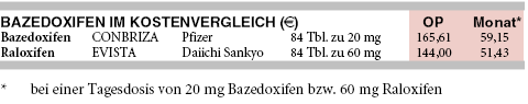 KOSTEN: Bazedoxifen (CONBRIZA) verteuert mit Monatskosten von 59 € für täglich 20 mg die Therapie der postmenopausalen Osteoporose gegenüber Raloxifen (EVISTA, 51 €/Monat für täglich 60 mg) um 15%.