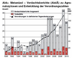 Eine 71-jährige Frau mit rheumatoider Arthritis und chronischem therapierefraktären Schmerzsyndrom wird wegen eines Schwächeanfalls mit Tachykardie und Hypoglykämie stationär aufgenommen. In der Klinik werden eine schwere Panzytopenie und deutlich erhöhtes C-reaktives Protein festgestellt. Die Patientin nimmt regelmäßig Metamizol (NOVALGIN, Generika) ein und seit 15 Jahren bis eine Woche vor Aufnahme Methotrexat (LANTAREL, Generika). Trotz Absetzens von Metamizol sowie Anwendung von Granulozytenkolonie-stimulierenden Faktoren, Folinsäure und Antibiotika sowie Transfusion von Thrombozytenkonzentrat bleiben die Blutzellreihen erniedrigt, und die Patientin stirbt wenige Tage später unter septischem Krankheitsbild (NETZWERK-Bericht 15.877). Das Institut für klinische Pharmakologie in Bremen berichtet aktuell über zwei weitere Patientinnen mit Blutbildungsschäden einschließlich Agranulozytose unter Metamizol, die seit Ende 2009 erfasst wurden (NETZWERK-Berichte 15.875, 15.876). Parallel zu den in den letzten Jahren stetig steigenden Verordnungen hat auch die Zahl der bei der Arzneimittelkommission der deutschen Ärzteschaft (AkdÄ) erfassten Verdachtsberichte von Agranulozytosen unter Metamizol zugenommen (siehe Abbildung: STAMMSCHULTE, T., AkdÄ 2010). Zudem wird über zwei Männer mit lebensbedrohlicher Anaphylaxie/anaphylaktoider Reaktion mit Hypotonie auf intravenöse Anwendung bzw. Einnahme von Metamizol berichtet (NETZWERK-Berichte 15.878, 15.879). Diese treten insbesondere bei vorbestehender Hypotonie, Hypovolämie oder hohem Fieber und mit zunehmender Dosis und schneller intravenöser Injektion häufiger auf (SCHOTT-SEIDENSCHWANZ, I. et al.: Bremer Ärztejournal 2011; 64: 20). Die strikten Indikationseinschränkungen in Deutschland verhindern die breite Anwendung des risikoreichen Mittels offenbar nicht. Dabei zeigen Länder, wie Schweden oder die USA (a-t 2003; 34: 38), dass Schmerzbehandlung und Fiebersenkung auch ohne Metamizol möglich sind, –Red