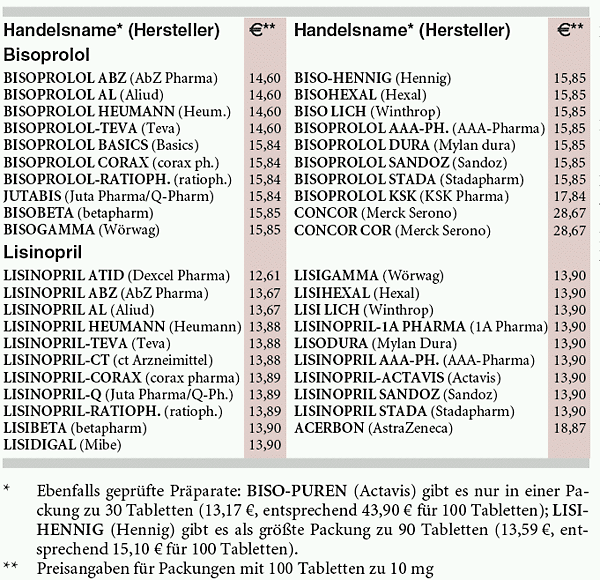 Das Zentrallaboratorium Deutscher Apotheker überprüft in zwei Reihenuntersuchungen 21 Fertigarzneimittel zu 10 mg Bisoprolol (CONCOR, Generika) und 22 Lisinopril-haltige Fertigarzneimittel (ACERBON, Generika) zu 10 mg. Alle geprüften Präparate erfüllen die Anforderungen des Europäischen und Amerikanischen Arzneibuches hinsichtlich Gleichförmigkeit der Masse, Gleichförmigkeit des Gehalts, In-vitro-Freisetzungsverhalten und Teilbarkeit (Teilung per Hand). Die Fertigpräparate mit Lisinopril werden zusätzlich auf Reinheit und Gehalt getestet und entsprechen ebenfalls diesen Arzneibuch-Anforderungen. Die Autoren bescheinigen den Präparaten "eine hohe pharmazeutische Qualität" (KAUNZINGER, A. et al.: Pharm. Ztg. 2011; 156: 1766-71 sowie 1866-8). Nachfolgend vergleichen wir die Preise der geprüften Präparate auf der Basis der Packungen mit 100 Tabletten zu jeweils 10 mg. Das Bisoprolol-Original CONCOR ist fast doppelt so teuer wie das preiswerteste Generikum, das Lisinopril-Original ACERBON immerhin fast 50% teurer. Aufgrund von Rabattverträgen können die für Krankenkassen entstehenden Kosten von den Listenpreisen abweichen.