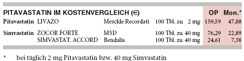 KOSTEN: Pitavastatin kostet mit 48 € pro Monat bei täglich 2 mg mehr als das Sechsfache eines Simvastatin-Generikums (z.B. SIMVASTATIN ACCORD, monatlich 7 € bei täglich 40 mg).