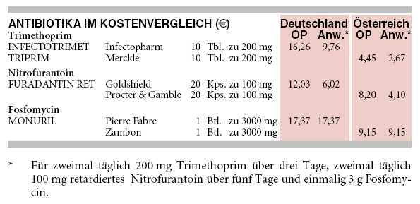 Entscheidet man sich gemeinsam mit der Frau für eine antibiotische Behandlung, so fällt unter den potenziellen Mitteln der Wahl die Entscheidung nicht leicht: Bei siebentägiger Therapie wirken zweimal täglich 200 mg Trimethoprim in einer randomisierten Studie ähnlich gut symptomatisch wie zweimal täglich 960 mg Co-trimoxazol (EUSAPRIM, Generika; 87% bzw. 85% symptomfrei nach 9 bis 15 Tagen).3 Die Trimethoprim-Sulfonamid-Fixkombination ist in Studien bereits bei dreitägiger Einnahme wirksam.1 Für die von der DEGAM* empfohlene dreitägige Therapie mit Trimethoprim2 finden wir lediglich eine methodisch mangelhafte randomisierte Studie zum Vergleich mit fünftägiger Therapie, die jedoch aufgrund des geringen Anteils ausgewerteter Patienten nicht aussagekräftig ist.4 Einmalig 320 mg Trimethoprim befreien von Beschwerden hingegen schlechter als zweimal täglich 160 mg über sieben Tage (71% bzw. 84% symptomfrei nach 2 Wochen).5 Trotz schlechterer Datenlage bevorzugen wir auch für die dreitägige Therapie Trimethoprim gegenüber Co-trimoxazol, da es deutlich weniger Störwirkungen verursacht (vgl. a-t 1998; Nr. 12: 112-4).