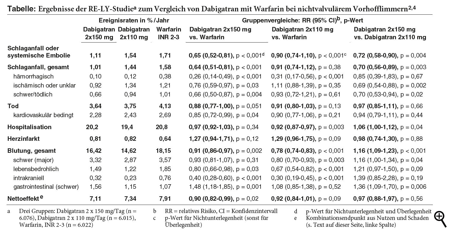 Unter beiden Dabigatrandosierungen**** kommt es tendenziell häufiger als unter Warfarin zu Myokardinfarkten (um 0,17% bzw. 0,18%). Schwere Blutungen sind unter zweimal 110 mg signifikant (um 0,7%), unter zweimal 150 mg nur numerisch seltener. Schwere Magen-Darm-Blutungen treten unter der höheren Dabigatrandosierung sogar signifikant häufiger auf als unter Warfarin (um 0,49%). Intrakranielle (um 0,44% bzw. 0,53%) und lebensbedrohliche Blutungen (um 0,36% bzw. 0,63%) sind jedoch unter beiden Dosierungen seltener. Zur Abschätzung des klinischen Nettoeffektes aus Nutzen und Schaden wird ein kombinierter Endpunkt aus Insult, systemischer oder Lungenembolie, Myokardinfarkt, Tod oder schwerer Blutung prädefiniert. Dieser ist unter zweimal 150 mg signifikant um 0,8% und unter zweimal 110 mg tendenziell um 0,57% seltener als unter Warfarin.2-4