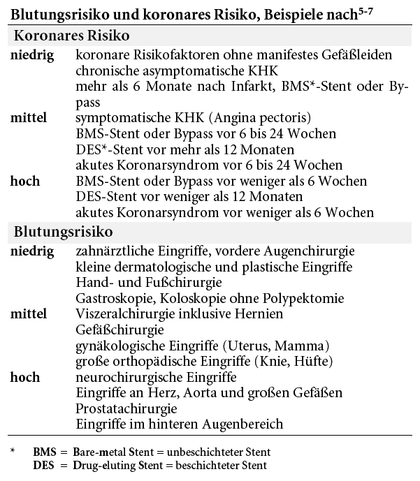 Ähnlich wie bei oraler Antikoagulation (a-t 2004; 35: 94-6) sind beim perioperativen Management unter Einnahme von Thrombozytenaggregationshemmern bei koronarer Herzkrankheit (KHK) Risiken durch Blutungen bei Beibehaltung der Therapie gegen Risiken durch Koronarereignisse bei Unterbrechung der Therapie abzuwägen. Risiken durch Blutungen werden durch die Häufigkeit, aber auch durch Lokalisation und Stillbarkeit bestimmt. Drohende Koronarereignisse sind Infarkte, ggf. Stentthrombosen und kardiale Todesfälle. Da belastbare Daten aus randomisierten Studien zum optimalen Vorgehen weitgehend fehlen, sind entsprechende Empfehlungen beispielsweise in Leitlinien überwiegend konsensbasiert und mit Unsicherheiten behaftet.1-3 Dies gilt auch für die Einschätzung des Blutungs- und koronaren Risikos (siehe Tabelle Seite 20).5-7
